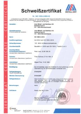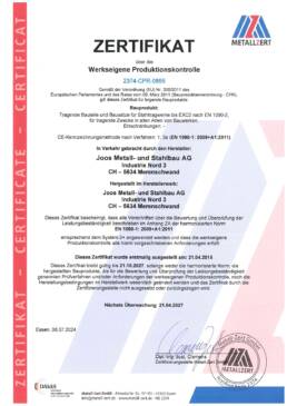 Als höchsten Qualitätsnachweis ist die Joos Metall- und Stahlbau AG nach ISO 9001:2015 (Qualitätsmanagement) zertifiziert. Das interne Kontrollsystem (IKS) sowie die EKAS 6508:2007 sind im Führungssystem integriert.